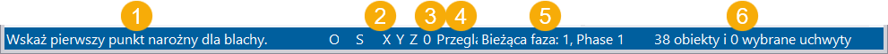 Pasek stanu jest obszarem znajdującym się w dolnej części okna głównego Tekla Structures. Podczas korzystania z poleceń postępuj zgodnie z instrukcjami wyświetlanymi na pasku stanu. Przykładowo podczas tworzenia elementu pasek stanu informuje, jak postępować i kiedy wskazywać punkty.