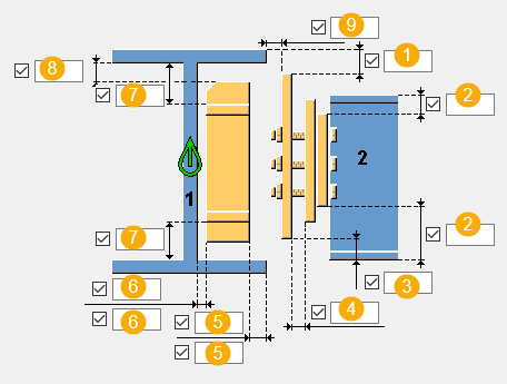 Komponent Blacha końcowa z żebrem częściowym (65) pozwala utworzyć połączenie belki z belką na blachę końcową. To połączenie tworzy blachę końcową na belce podrzędnej, blachę żebra i łączącą blachę czołową na belce głównej. Dodatkowo można dodać blachy żebra po obu stronach, dodać blachę dolną do spodu blachy żebra głównego, a także utworzyć podkładki z blachy.