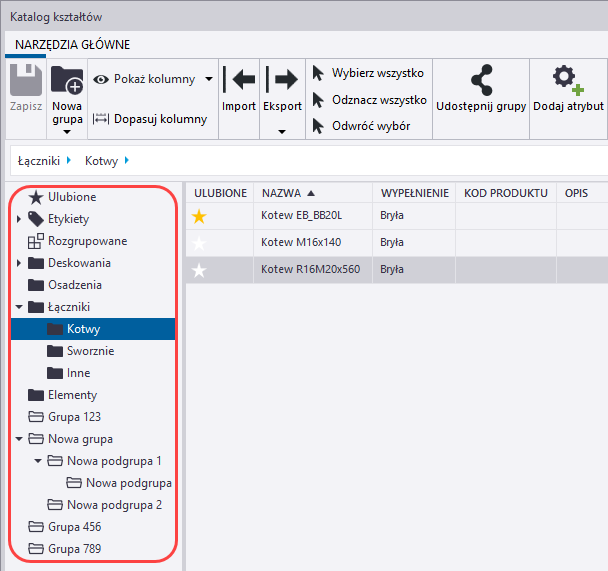 Kształty w katalogu kształtów można uporządkować w hierarchiczną strukturę grupy.