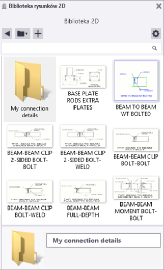 W oknie Biblioteka 2D możesz dodawać do dowolnego rysunku detale znajdujące się w folderze systemu, projektu, folderze firmowym lub folderze bieżącego modelu.