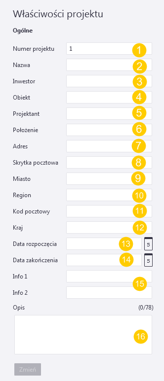 Wielokrotnie w trakcie realizacji projektu potrzebne będą takie informacje jak numer i nazwa projektu. Należy zaktualizować właściwości projektu na początku każdego projektu, aby raporty i rysunki automatycznie uwzględniały poprawne informacje. Wszystkie pola są opcjonalne.