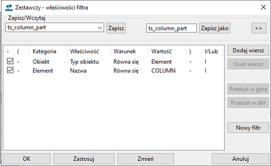 Aby otworzyć okno dialogowe Zestawczy - właściwości filtra, kliknij przycisk Filtr, utwórz filtr na podstawie Element - Nazwa i Obiekt - Typ obiektu dla słupów i kliknij Zmień.