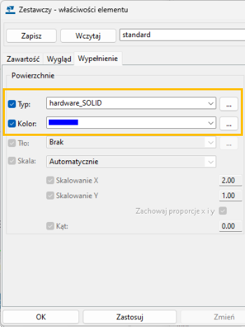 Aby przejść do okna dialogowego Zestawczy - właściwości elementu, kliknij Element, na karcie Wypełnienie wybierz wypełnienie, ustaw niebieski kolor wypełnienia, a następnie kliknij Zmień.