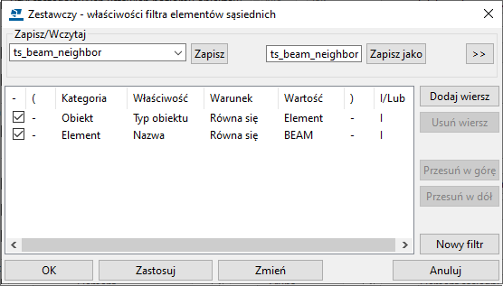 Aby otworzyć okno dialogowe Zestawczy - właściwości filtra elementów sąsiednich, kliknij przycisk Filtr elementów sąsiednich, utwórz filtr na podstawie Element - Nazwa i Obiekt - Typ obiektu dla belek i kliknij Zmień.