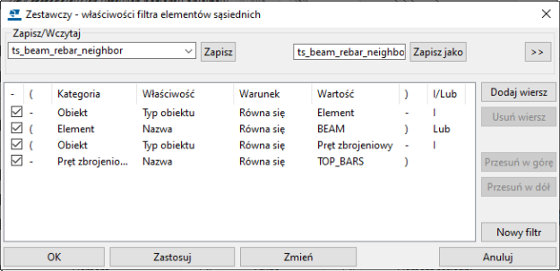 Przykład filtra elementu sąsiedniego i zbrojenia sąsiedniego