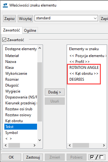 W znakach elementów można wskazywać obrót belek spiralnych. Kąt obrotu jest określony we właściwościach belek spiralnych w modelu.