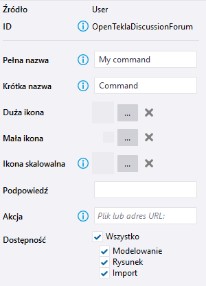 Polecenia użytkownika są zapisywane w folderze ..\Users\<user>\AppData\Local\Trimble\Tekla Structures\<version>\UI\Commands.