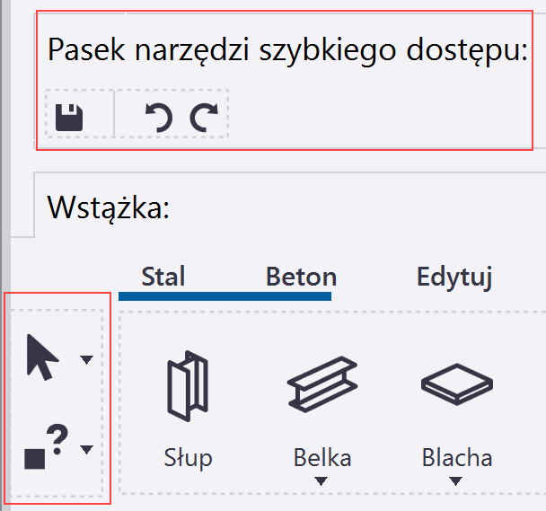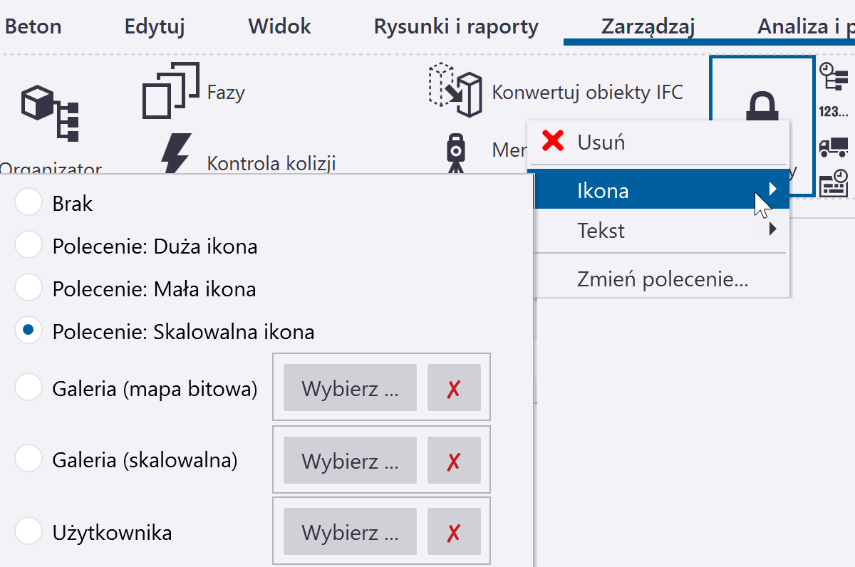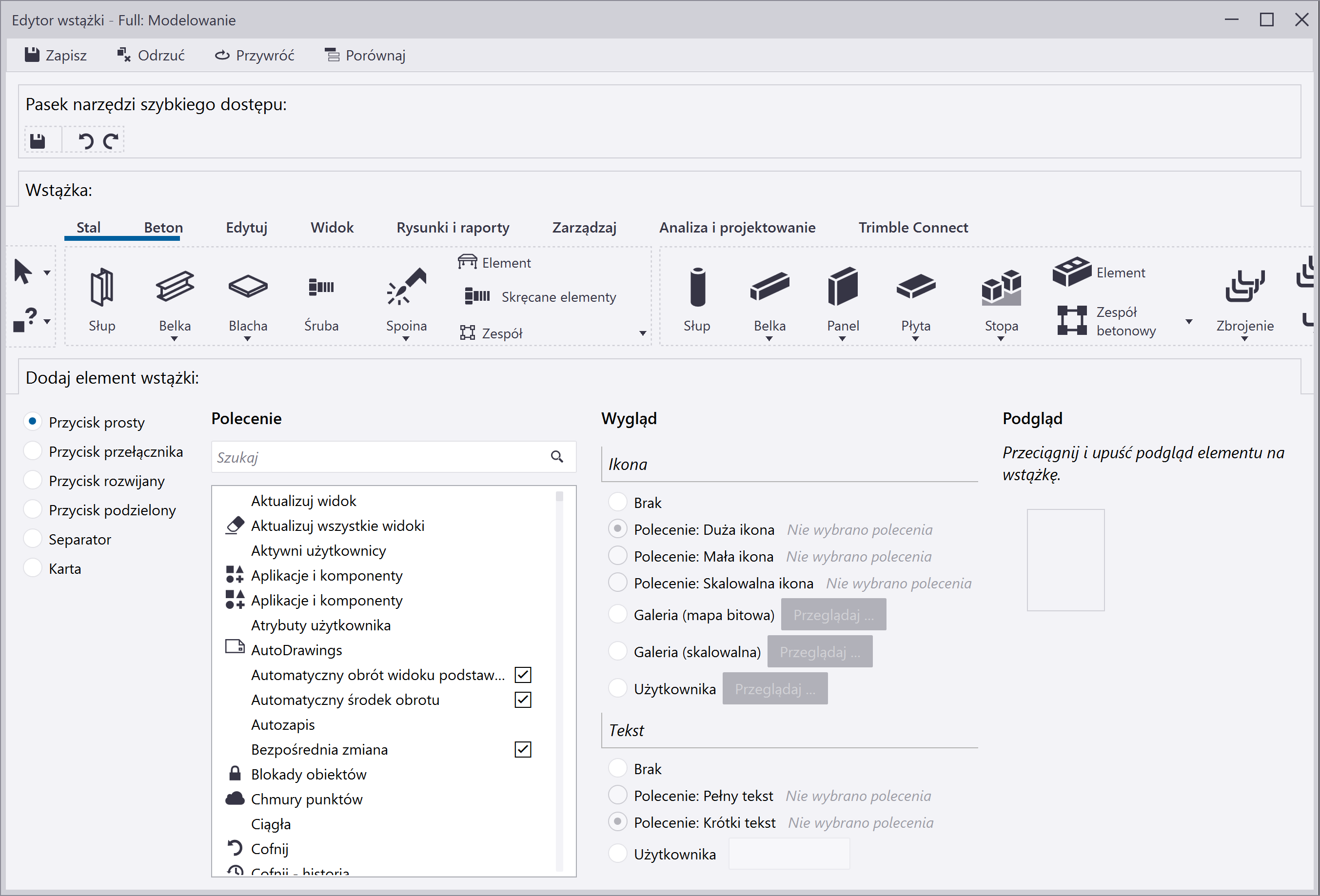 Można dodawać, przenosić i zmieniać nazwy kart wstążki, określać ich wyrównanie oraz ukrywać niektóre karty, jeśli nie są potrzebne w bieżącym projekcie. Przykładowo w przypadku modelowania tylko elementów stalowych można tymczasowo ukryć kartę Beton.