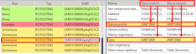 Zostaną wyświetlone: lista zmian i lista szczegółów właściwości. Zawartość listy zmian zależy od zawartości IFC i zawiera wszystkie typy obiektów fizycznych. Kolory są takie same jak na liście Wykrywanie zmian.