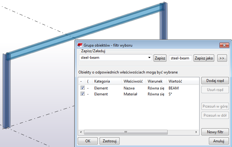 - Utwórz regułę filtrowania, która powoduje wybranie elementów według materiału S* (stal).