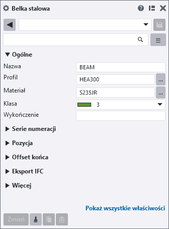 Każdy element ma definiujące go właściwości, takie jak materiał, profil i położenie. Ponadto elementy mają atrybuty użytkownika (UDA), za pomocą których są przekazywane dodatkowe informacje o elemencie. Za pomocą właściwości elementu w filtrach wyświetlania i filtrach wyboru można np. wybierać, modyfikować i ukrywać elementy. Właściwości elementów i atrybuty UDA można też stosować w szablonach rysunków i raportów.
