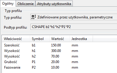 Po ukończeniu zadań otrzymamy symetryczny profil w kształcie litery C o wymiarach b1 = b2 i h2 = h3. Korzystając z profilu w modelu, można zmieniać następujące wymiary: