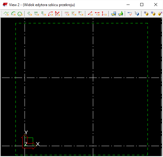Przy pierwszym otwarciu okna edytor szkiców widok jest pusty. Współrzędne siatki i etykiety, które można wyświetlić w oknie edytor szkiców, zależą od właściwości siatki rzeczywistego modelu Tekla Structures.