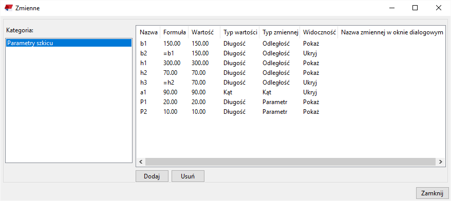 Okno dialogowe Zmienne służy do określania właściwości naszkicowanego profilu. Okno dialogowe Zmienne jest otwierane automatycznie po otwarciu okna narzędzia edytor szkiców.