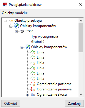 W menu Przeglądarka szkiców wyświetlane są obiekty (linie, łuki, okręgi, ograniczenia, wymiary i fazowania) naszkicowanego profilu w hierarchicznej strukturze drzewa.