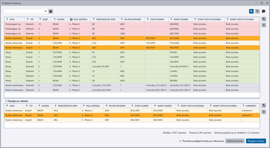 W oknie dialogowym Podgląd numeracji można użyć górnej, głównej tabeli, aby wyświetlić właściwości obiektu, które wpływają na numerację. Można wybrać wiersze w tabeli głównej, a następnie w tabeli Pojedyncze obiekty przejrzeć poszczególne pojedyncze powiązane obiekty. Ta opcja przydaje się, gdy obiekty mają różne wartości właściwości, które nie wpływają na numerację, takie jak atrybut użytkownika Komentarz. Wartość Różne jest wyświetlana dla tych właściwości obiektu w tabeli głównej, ale w tabeli Pojedyncze obiekty można zobaczyć wartości dla każdego obiektu z osobna.