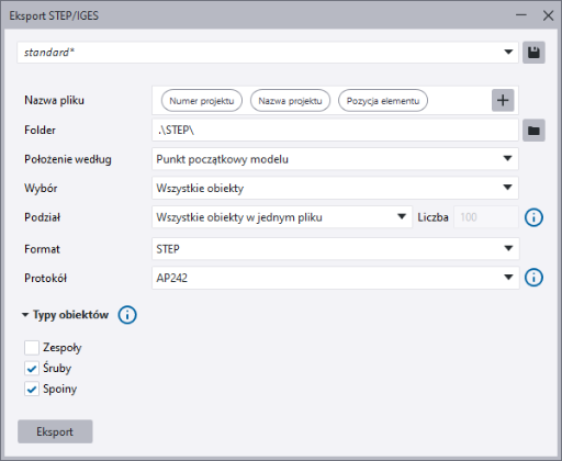Można wybrać, czy w eksporcie mają być uwzględniane Zespoły, Śruby lub Spoiny. W przypadku wybrania tej opcji Zespoły elementy stalowe są eksportowane jako całe zespoły, w przeciwnym razie elementy stalowe są eksportowane jako pojedyncze obiekty.