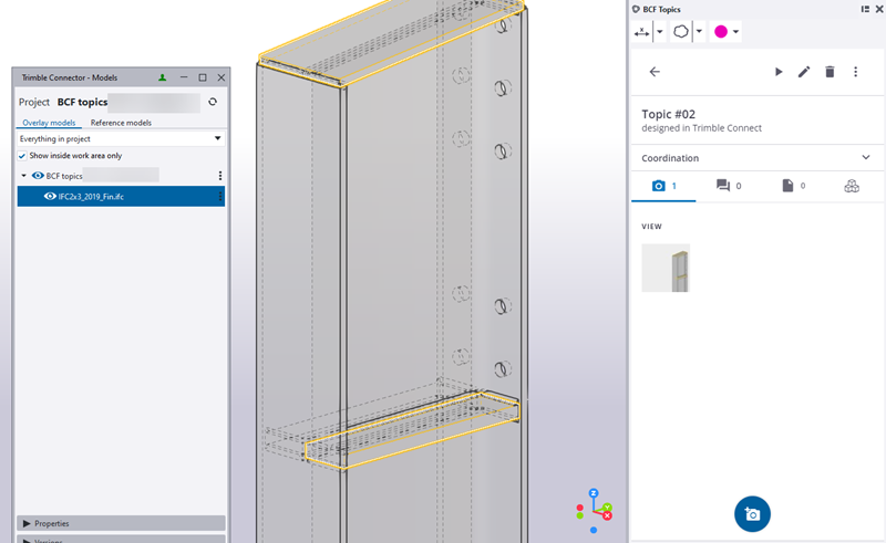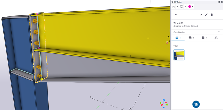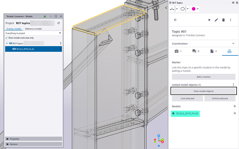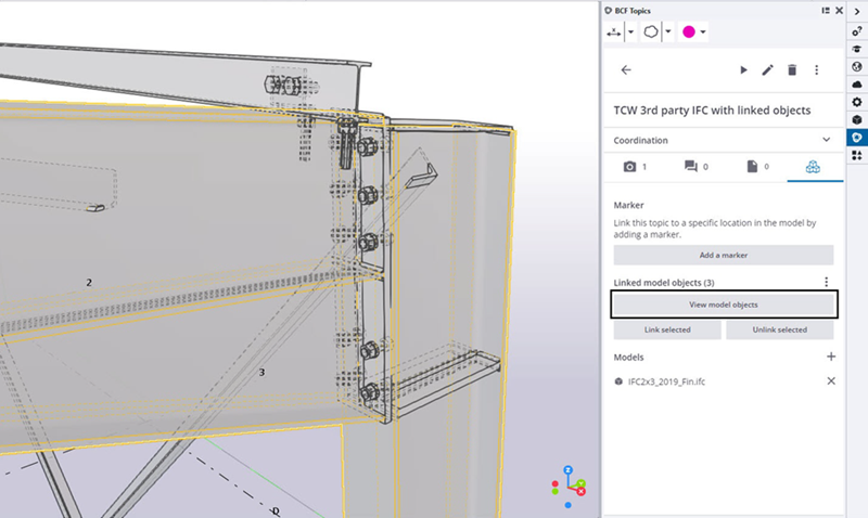Można teraz również łączyć obiekty z tematami BCF w Tekla Structures, a po kliknięciu Wyświetl obiekty modelu w Trimble Connect zostaną one podświetlone.