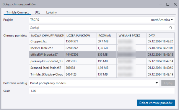 Dołączanie chmury punktów hostowanej w projekcie Trimble Connect: