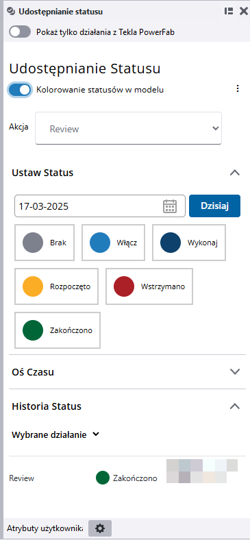Całkowicie odnowione narzędzie Udostępnianie statusu jest teraz zintegrowane z Tekla Structures i Trimble Connect, umożliwiając udostępnianie statusów bez pobierania i instalacji. Za pomocą narzędzia Udostępnianie statusu można ustawiać, przeglądać i zmieniać statusy obiektów modelu i zespołów. Statusem obiektu może być na przykład stan produkcji lub stan budowy. Jeśli korzystasz z funkcji Udostępnianie statusu między Tekla Structures oraz Tekla PowerFab, możesz filtrować czynności w Tekla Structures, tak aby wyświetlać tylko te z Tekla PowerFab.
