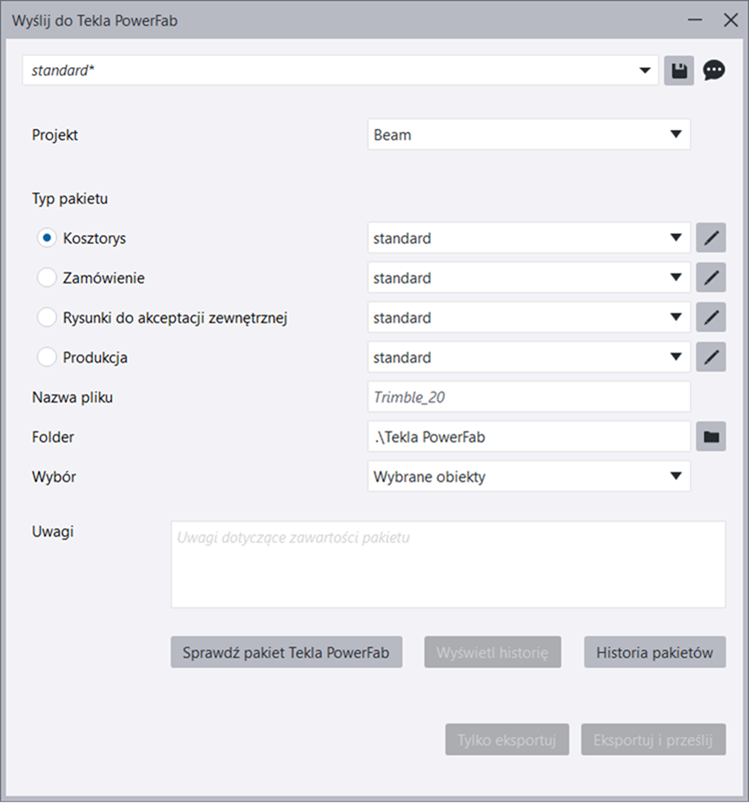 Narzędzie do przesyłania pakietów prowadzi użytkownika podczas eksportowania i przesyłania różnych typów pakietów do producenta na dowolnym etapie projektu. Można wyeksportować następujące dane z Tekla Structures lokalnie, aby je sprawdzić lub bezpośrednio do Tekla PowerFab w celu kosztorysowania, zamówienia materiałów i produkcji: