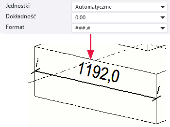 W poniższym przykładzie znak wymiaru zawiera przecinek, gdy we właściwościach wymiaru wprowadzone są poniższe ustawienia wymiarów, a omawiana opcja zaawansowana ma wartość XS_DIMENSION_DECIMAL_SEPARATOR=,