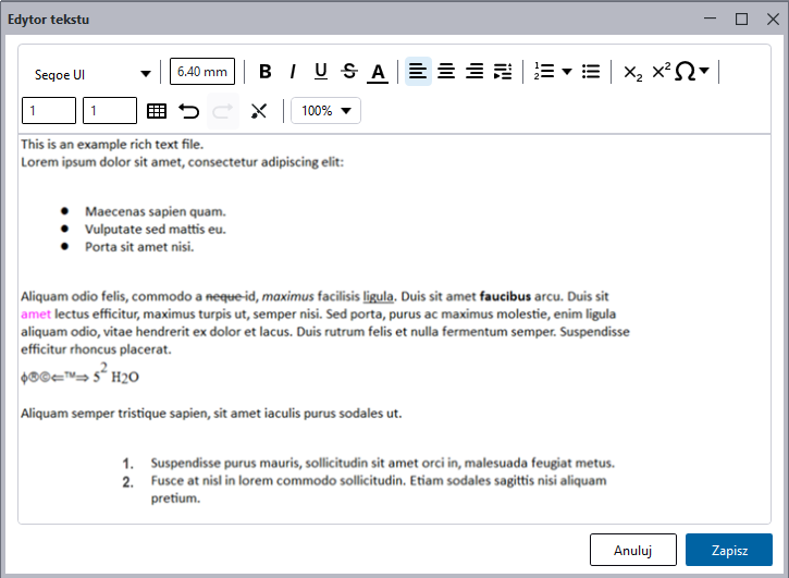 Aby sformatować zawartość tekstu sformatowanego w wbudowanym edytorze tekstu, kliknij dwukrotnie dodany tekst. Szczegóły znajdziesz w sekcji „Edytowanie osadzonego tekstu w pełnym Edytorze tekstu” poniżej.