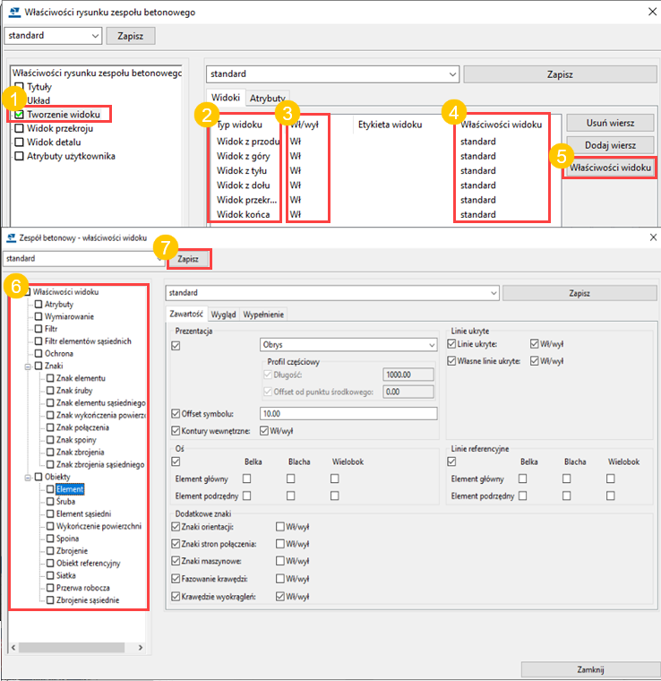 Rysunki pojedynczych elementów, zespołów i zespołów betonowych mają dwa typy właściwości automatycznych: specyficzne dla rysunku i specyficzne dla widoku.