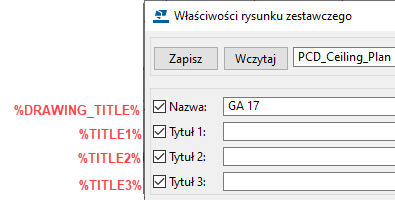 W przypadku wprowadzania atrybutów użytkownika lub atrybutów szablonu umieść wokół nich pojedyncze znaki % w oknie dialogowym Opcje zaawansowane. %DRAWING_TITLE% jest wartością domyślną, a %TITLE% daje taki sam wynik. Jeśli używasz tych atrybutów, do znaku detalu jest dodawana nazwa rysunku docelowego wprowadzona w polu Nazwa w oknie dialogowym właściwości rysunku. W przypadku wprowadzania atrybutu %TITLE1%, %TITLE2% lub %TITLE3% do znaku jest dodawany tekst z pól Tytuł 1 - Tytuł 3 we właściwościach rysunku docelowego. Ten sam efekt można również uzyskać za pomocą formatów %DR_TITLE1%, %DR_TITLE2% i %DR_TITLE3%.