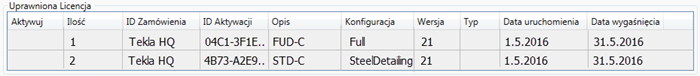 Tekla License Administration Tool wyświetla informacje o uprawnionych licencjach, aktywowanych licencjach i użytkowaniu licencji. Za jego pomocą można również aktywować, dezaktywować i naprawiać licencje.