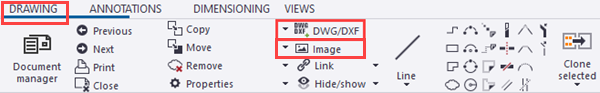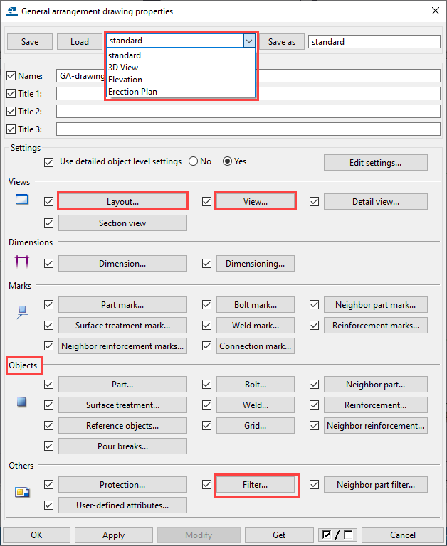 Drawing objects are organized inside drawing views, which are placed in the selected drawing layout according to the selected settings: