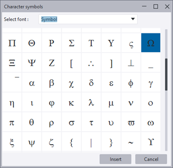 , and a list of the last 5 inserted character symbols is displayed as well as a list of common character symbols. To display the