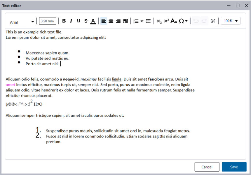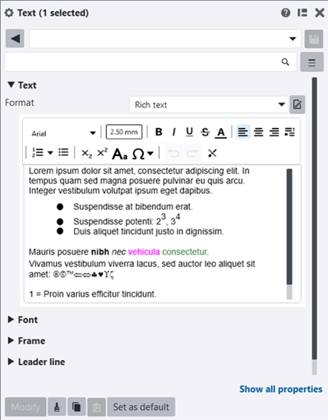 You can add several lines of plain text or formatted rich text in an open drawing inside a text object using the current text properties. You can modify the text and its properties after adding the text object. Rich text content can also be formatted in a built-in text editor.