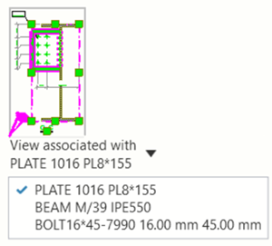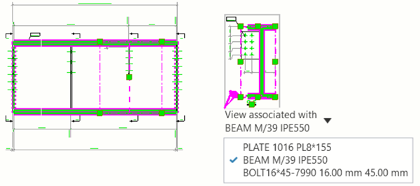 In fabrication drawings, the associativity rule list for the section view is displayed, and you can see all objects the section view can be associated with. Tekla Structures selects the associated object for the section view automatically at view creation and shows it in the associativity label. You can also change the currently associated object.