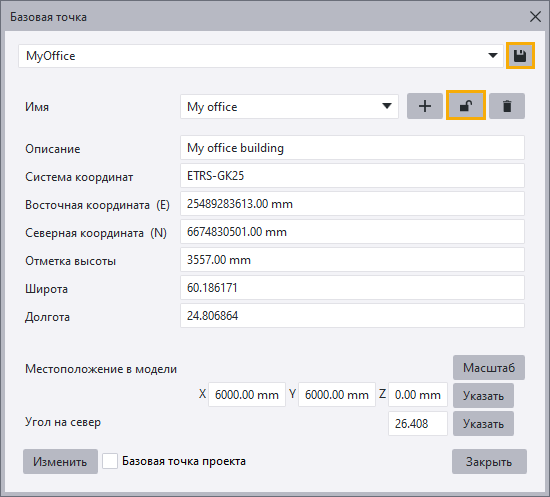 Теперь можно заблокировать базовую точку, чтобы не допустить внесения нежелательных изменений другими пользователями, работающими в той же модели. Для этого нажмите кнопку