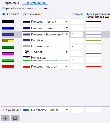 Чтобы использовать для всех распечатываемых объектов только один цвет и толщину линии, задайте эти параметры в строке По умолчанию и удалите все строки свойств линии. Если вы выберете вариант По объекту, на выводе будут использоваться цвета объектов чертежа в исходном виде. |
