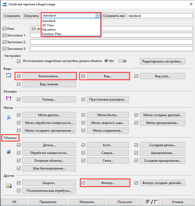 К объектам чертежа относятся объекты строительной конструкции (детали, болты, сварные швы, фаски, армирование, обработка поверхности и т. д.), объекты аннотаций (метки, примечания, размеры, текст, присоединенные объекты, опорные объекты и т. д.) и эскизные объекты (линии, прямоугольники, облака, окружности и т. д.).