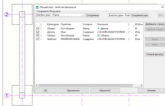 (1) Таблица местоположений на сетке дает возможность понять, на какой линии сетки сборка находится в модели
