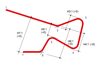 Расстояние перпендикулярно участку от внешней кромки до внешней кромки или по касательной к изгибу. Расстояния являются положительными или отрицательными в зависимости от направления участка. Пример.