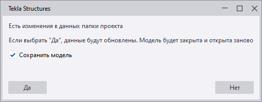 Когда Tekla Structures обнаруживает расхождение между данными локальной модели и данными в папке проекта или компании в Trimble Connect, появляется следующее уведомление: