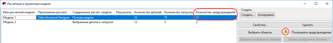 Если при создании расчетной модели возникли проблемы, Tekla Structures отображает предупредительный знак в диалоговом окне Расчетные и проектные модели, когда вы выбираете расчетную модель.