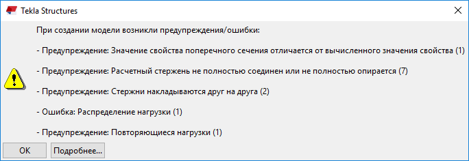 Tekla Structures выводит диалоговое окно предупреждения с перечнем типов проблем, возникших при создании расчетной модели. Например: