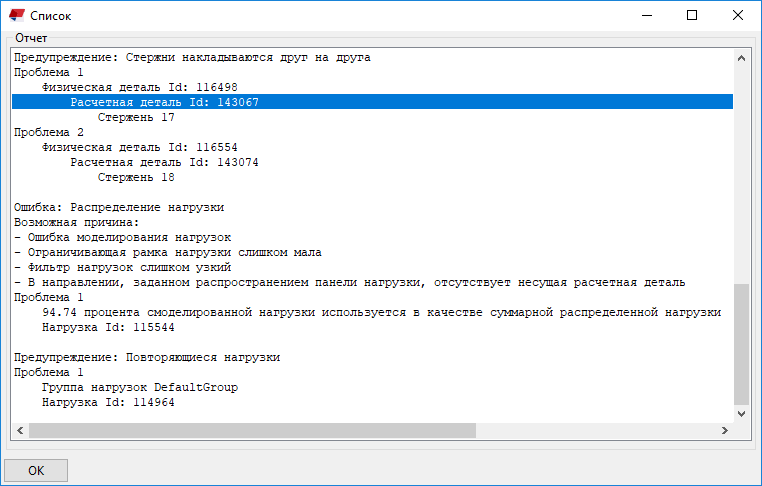 Tekla Structures выводит подробный список предупреждений и ошибок. Например: