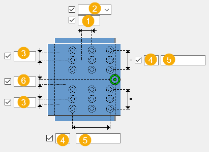 Расстояние между болтами. Значения расстояний между болтами разделяются пробелами. Введите по значению для каждого расстояния между болтами. Например, для 3 болтов вводится 2 значения. |