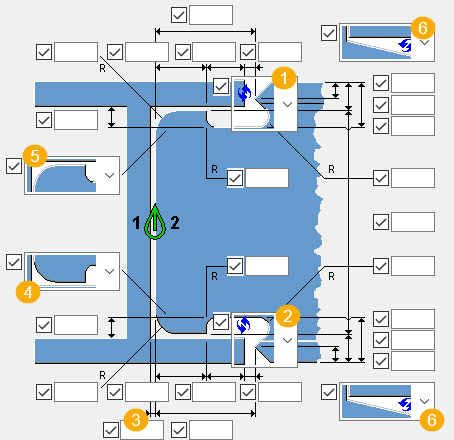 Для создания вырезов в направлении полки служит вкладка Рисунок 2. Параметры на этой вкладке доступны только при условии, что на вкладке Рисунок 1 в качестве типа выреза выбран вариант Произвольно. При выборе на вкладке Рисунок 1 специального типа выреза (Heerema, HSM) в пользовательские атрибуты автоматически вводятся предопределенные значения.