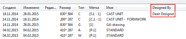 В диалоговом окне Диспетчер документов появился столбец для нового пользовательского атрибута, в котором отображается имя и фамилия проектировщика: