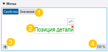 (1) Нажмите кнопку Свойства или Значения, чтобы отобразить имя или значение свойства на виде редактора меток. Эти кнопки доступны при редактировании существующей метки. (2) В области предварительного просмотра меток отображаются добавленные элементы, а также представление, выбранное для меток. Элементы можно перетаскивать в другое место. Чтобы удалить элемент, нажмите красную кнопку удаления (3) Новый элемент. С помощью кнопки Дополнительные сведения об элементах меток см. в разделе «Элементы меток в метках чертежей». (4) При нажатии кнопки % отображается текущий уровень масштабирования в области предварительного просмотра. Масштаб можно увеличить или уменьшить путем прокрутки средней кнопкой мыши. С помощью кнопки можно изменить масштаб до наилучшего соответствия. |