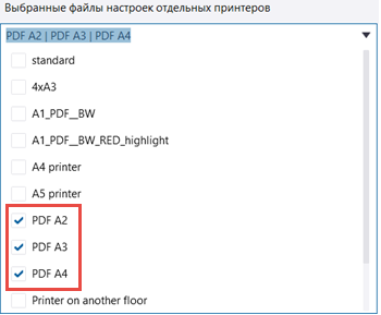 При печати набора чертежей в режиме нескольких принтеров с использованием приведенных выше файлов настроек отдельных принтеров для всех чертежей формата A4 будут создаваться файлы .pdf с префиксом A4_, для всех чертежей формата A3 — с префиксом A3_, а для всех чертежей формата A2 —файлы .pdf с префиксом A2_.