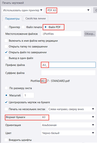 - PDF A3: Формат бумаги — A3, префикс файла — A3_