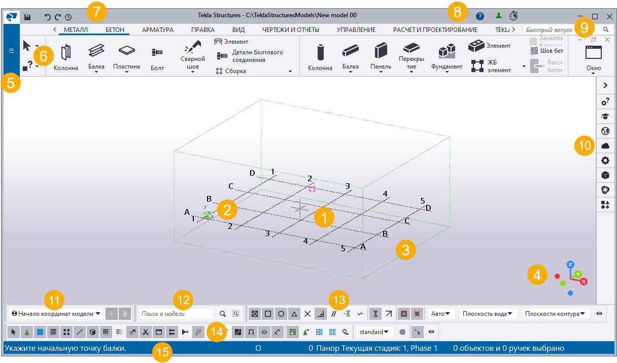 (1) Это ваша модель Tekla Structures. Если вы начинаете работу над совершенно новым проектом, на этом этапе вы будете видеть только созданный по умолчанию вид модели и пустую сетку.